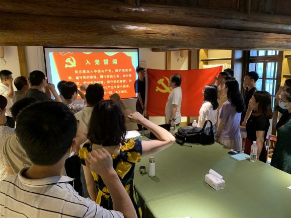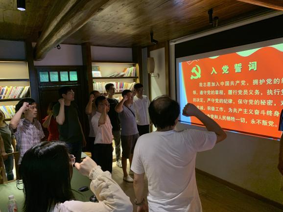 参观结束后,在大陈村萃文中学旧址,在公司党总支书记朱峻同志领誓下,42位党员教师们重温了入党誓词,铭记那一年许下的誓言:“我志愿加入中国共产党……随时准备为党和人民牺牲一切,永不叛党。”铿锵恢宏的誓词,强烈震撼着在场的每一位党员,一字一句,神圣而豪迈,铮铮誓言,体现了党员同志们对中国共产党的无限忠诚,坚定了入党使命,奋斗初心。