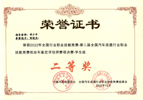 毕少平指导员工获2022全国机动车鉴定赛项二等奖