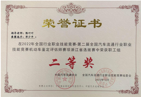 毕少平获2022浙江省机动车鉴定赛项职工组二等奖