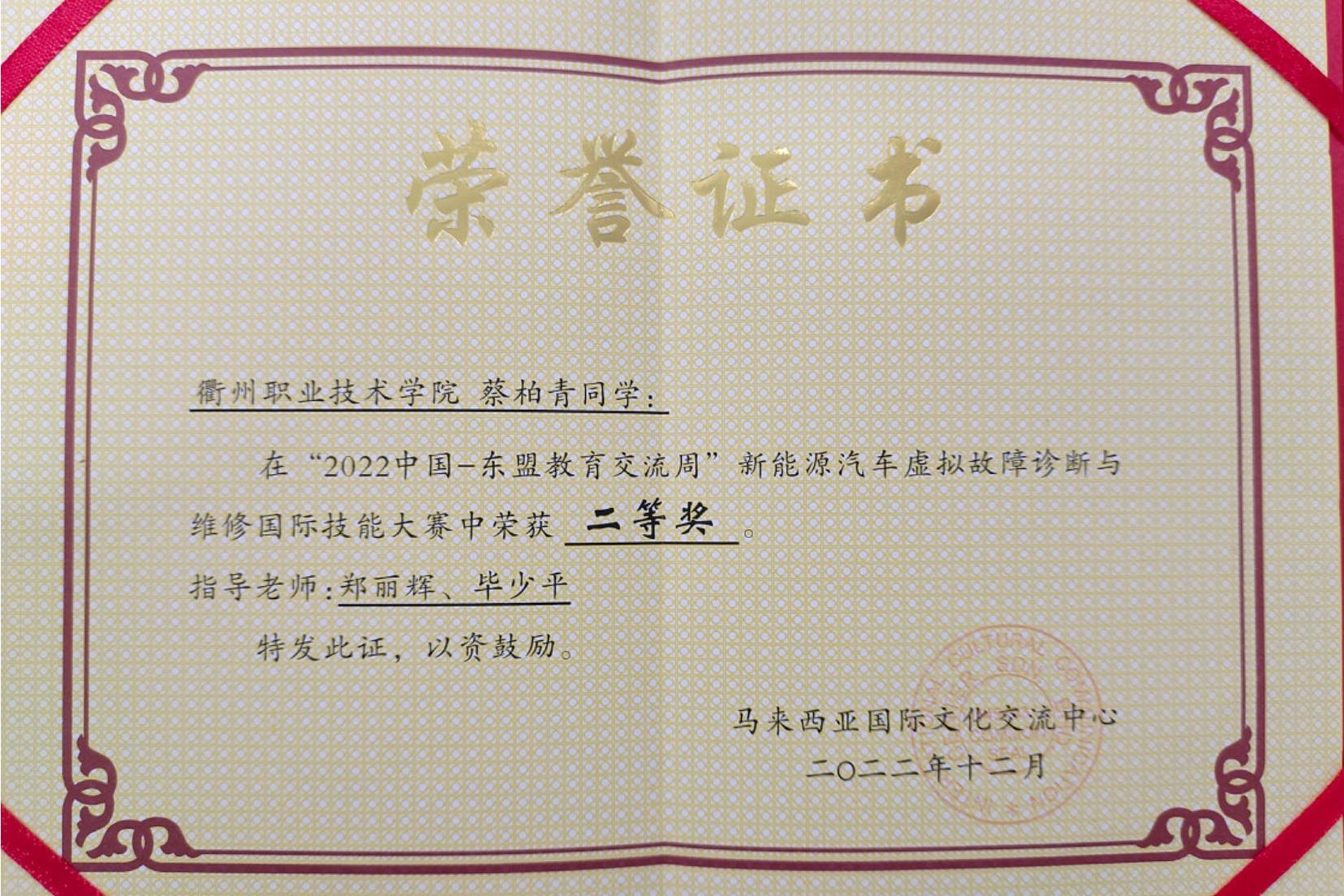 郑丽辉、毕少平指导员工获“2022中国-东盟教育交流周”新能源汽车虚拟故障诊断与维修国际技能大赛二等奖