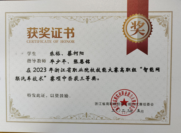 毕少平指导员工获2023浙江省高职员工技能竞赛智能网联汽车项目三等奖