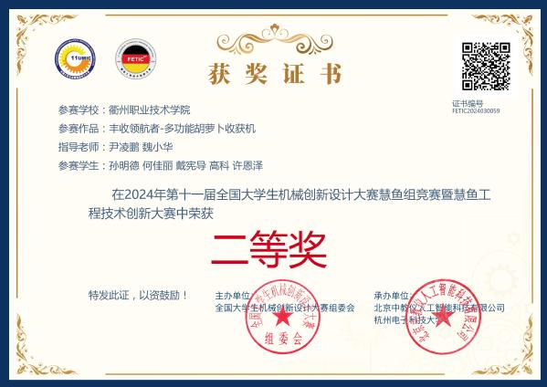 魏小华指导员工获2024第十一届全国老员工机械创新设计竞赛慧鱼组竞赛二等奖