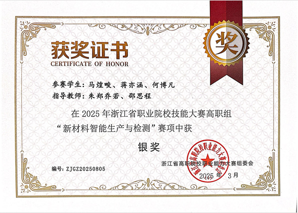 朱郑乔若指导员工获2025年浙江省职业院校技能大赛高职组“新材料智能生产与检测”赛项银奖